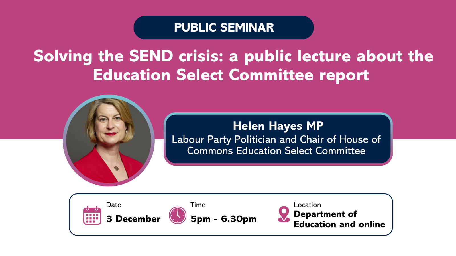 The lecture will be discussing the Education Select Committee’s recent report into Solving the Special Educational Needs and Disabilities (SEND) Crisis.